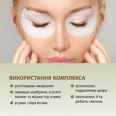 Это двойной уход — 100 тканевых патчей (для нижнего и верхнего века) и фитоэссенция. Вместе они обеспечивают минимум 50 эффективных процедур, глубоко увлажняют, питают и омолаживают кожу вокруг глаз.